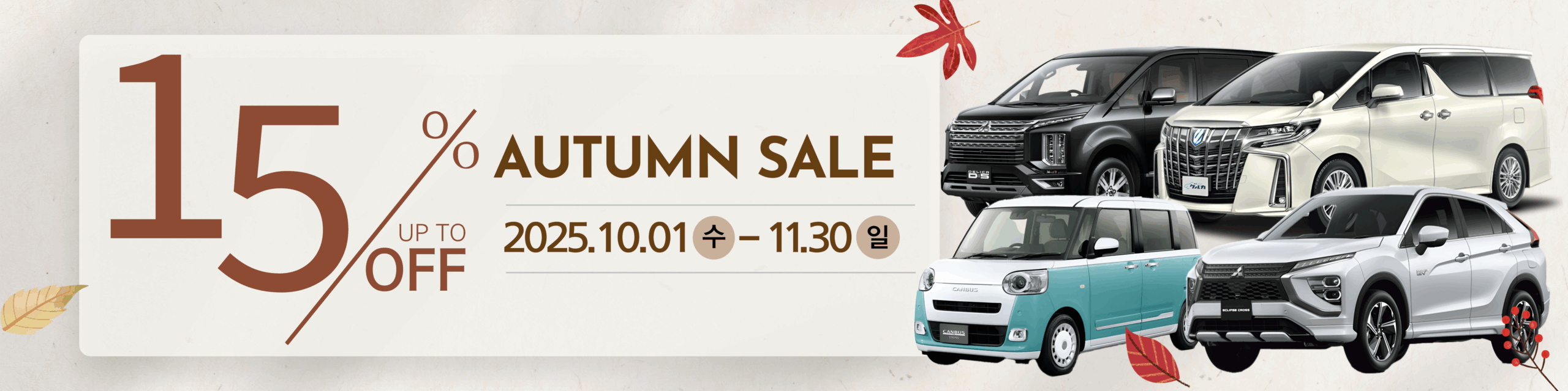예약일 (일본 현지기준)2025년 10월 1일부터 11월 30일까지 출발에 한함주의・캠페인으로 예약 하시는 경우 다른 캠페인과 중복 할인 불가・차량 색상, 차종 등은 지정할 수 없습니다.・2일 이상 예약 시 적용・일부 기간은 캠페인이 적용되지 않을 수 있습니다. ・캠페인 적용 후 잔금은 현금만 결제 가능합니다. 에약하기